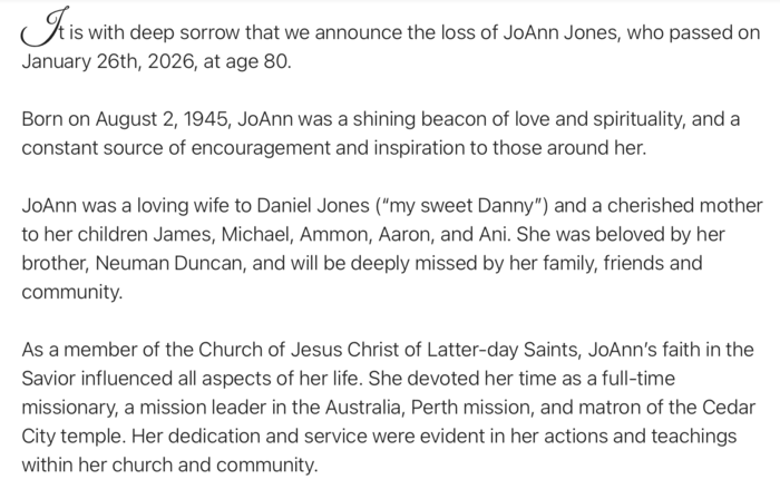 To this day, when a website asks for the name of my best childhood friend, my answer is always “JoAnn.” From the very beginning, Jo Ann was someone special—beautiful inside & out, (I always envied Her GORGEOUS hair:~)! She was brilliant, kind, honest, musically gifted, and a wonderful athlete. I can’t count the number of foot races we ran that ended in a tie (I tied her at least a couple of times I think:~). I wanted to play the piano like she did; but, no matter how much I practiced, I didn't have the talent she had. We played hopscotch or jumped on our pogo sticks & did our homework together almost every day until I left for Wasatch Academy in ninth grade. Jo Ann was a fabulous influence on me during those formative years—steady, encouraging, and joyful. She made life better just by being part of it! She was always willing to try the craziest things with me, like doing double backbends together all the way from my house to the school, climbed up doorways & the walls in my house -laughing the entire time. I also carry warm memories of her WONDERFUL family—her beautiful Mom, Audrey, teaching JoAnn, MaryAnn, Elizabeth, and me to dance the Hyland Fling. Those memories are treasures I’ve held onto my whole life. Jo Ann often asked me to become baptized in the Mormon Church (that was our conversation the last time she called me). This is how I knew she loved me too, and wanted us to be together in Heaven. I will miss her tremendously, but I'm forever thankful that I was so blessed to have her in my life!